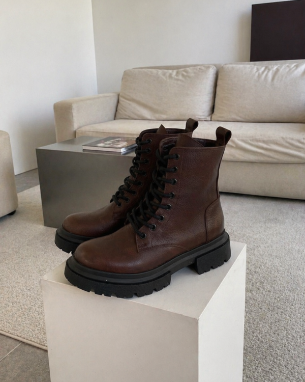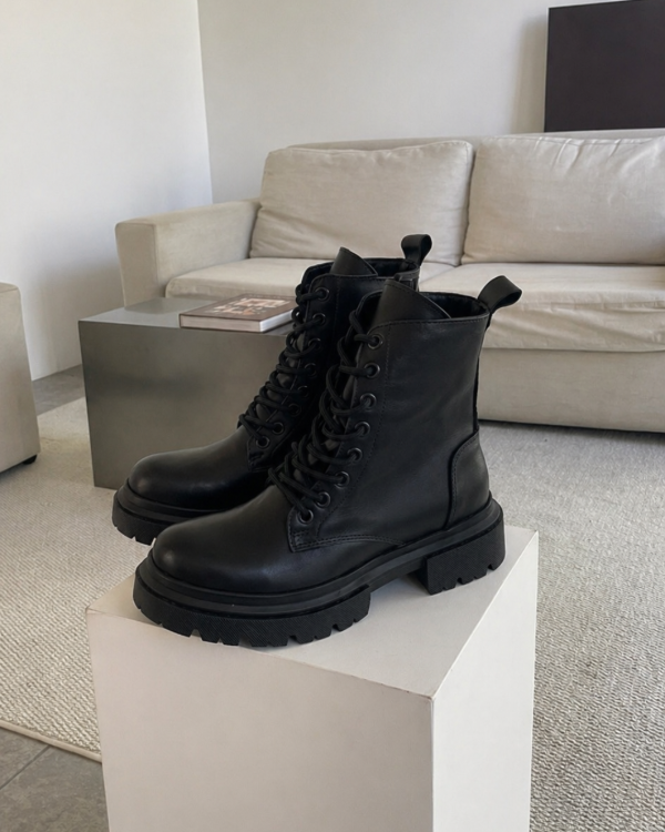 Borcego de cuero vacuno de caña mediana con cierre al costado y base de goma antideslizante.